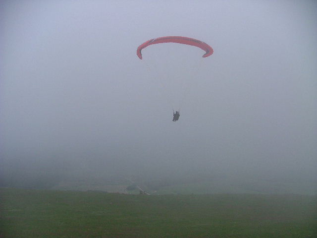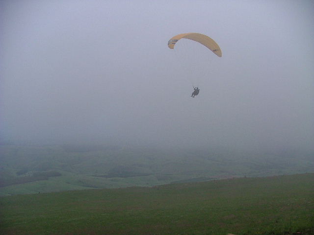 We arrived on Dumbe only to find that the orographic cloud was only 10 meters above the NNE takeoff and dropping by the minute but the wind was perfect, there was no time to spare. Within seconds the cloud ingulped us... so we decided to walk down the slope to just under the cloud to layout! We waited for a window and off we went... What a view and an experience to be able to ridgesoar an orographic cloud. What a fantastic flight! |