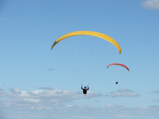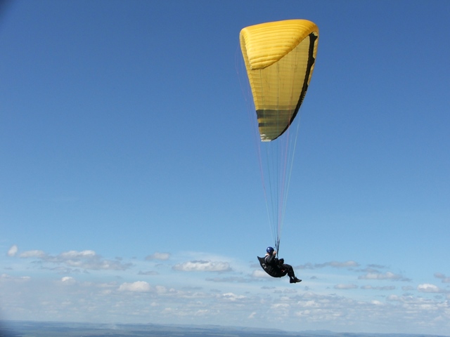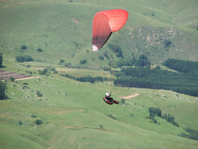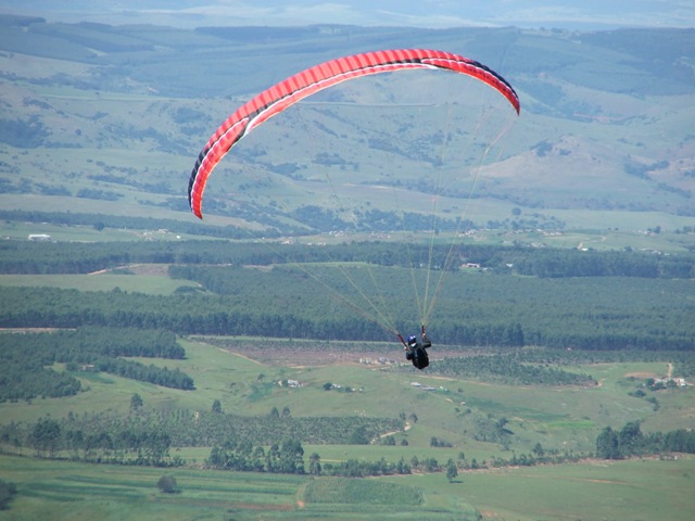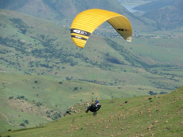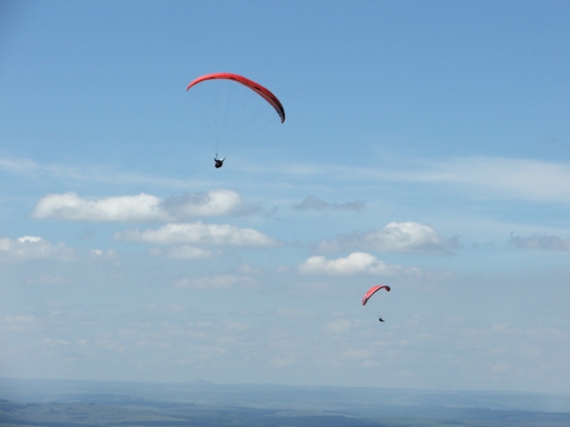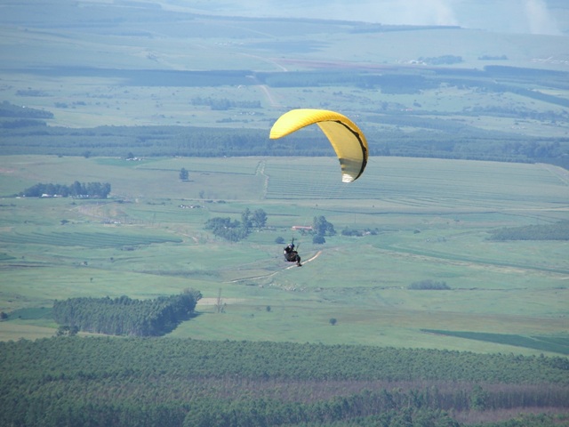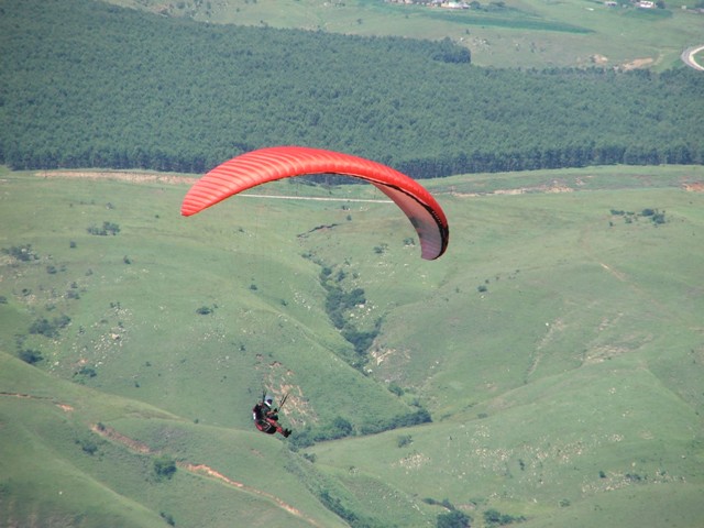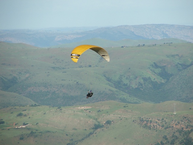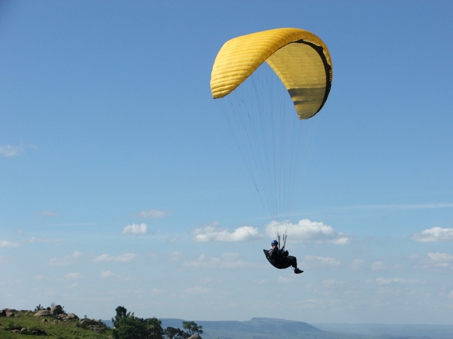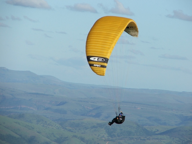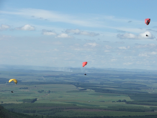 Saturday the weather was good, enabling Billie and Morne to climb to 580m ATO before leaving the mountain and to glide 5km before finding the next thermal bubble. This bubble didn't impress Billie as he only climbed 50m for the seven times that he circled in and out of such a small thermal, so he notified Morne that he was heading out for the next promising trigger point. He was mistaken as the trigger didn't work so he flew along the forest line sinking out lower and lower in search of something better, only to find a small consistent bubble at the end of the field which eventually turned into a thermal which took him up to 819m ATO, what a sight and feeling to be able to thermal up above to above the cloud base! Morne then joined Billie in glide and search for another thermal, only to land 15.1km from takeoff. Never the less, fantastic views, a low save and a flight to remember! Sunday the weather was similar enabling Morne to again leave Dumbe to complete a 31,5km flight in 2,5hours with maximum height of 917 ATO, while the rest of us bottomed landed. –Well done Morne, wish we all could have joined you! We rushed up the mountain to have a second chance, this time Billie managed to have a short scenic flight over PaulPietersburg while only getting to 250m ATO in the thermals over the flat lands and to complete a 6.5km flight. After all the cross country flights a fantastic valley release was enjoyed by all.