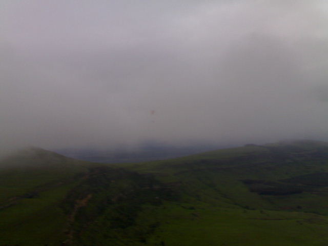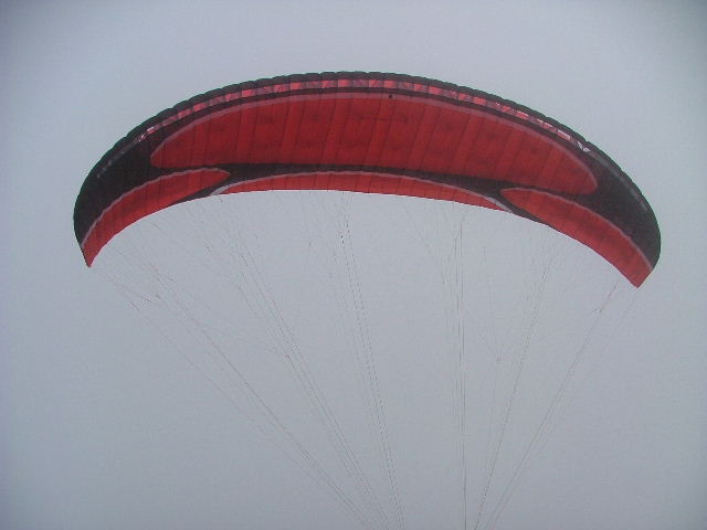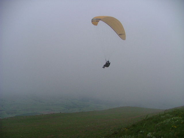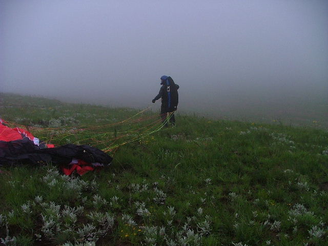 We arrived on Dumbe only to find that the orographic cloud was only 10 meters above the NNE takeoff and dropping by the minute but the wind was perfect, there was no time to spare. Within seconds the cloud ingulped us... so we decided to walk down the slope to just under the cloud to layout! We waited for a window and off we went... What a view and an experience to be able to ridgesoar an orographic cloud. What a fantastic flight! |